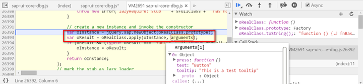 From the code below we can understand the UI5 framework uses a lazy load working style: the corresponding js file for a given control is never initially loaded until the control is really used in the code ( or explicitly required by “jQuery.sap.require(“XXXX”)” ). Step into line 26384 again: