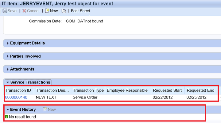 After I finish all necessary customizing and add one object to service order, the event history assignment block is empty. I expect there is one entry which records the