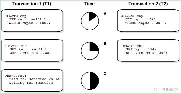 A deadlock can occur when two or more users are waiting for data locked by each other. Deadlocks prevent some transactions from continuing to work. Figure 13-3 is a hypothetical illustration of two transactions in a deadlock.