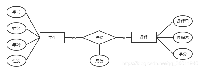 其中,(学号,姓名,年龄,性别)为学生的属性,(成绩)为选修关系的属性,(课程号,课程名,学分)为课程的属性。学生和课程之间的关系是多对多,即一个学生可以选择多门课程,一门课程可以被多个学生选修。