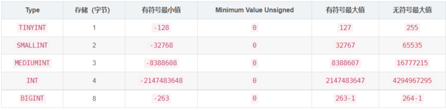 MySQL支持SQL标准整数类型INTEGER(或INT)和SMALLINT。作为标准的扩展,MySQL还支持整数类型TINYINT、MEDIUMINT和BIGINT。下表显示了每个整数类型所需的存储空间和范围。