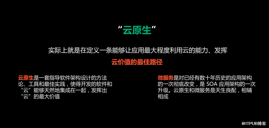 而于爽的话则来得更为直接并且易于理解,云原生实际上就是在定义一条能够让应用最大程度利用云的能力、发挥云价值的最佳路径,也可以理解成一套指导软件架构设计的方法论、工具或者说最佳实践,可以使得开发的软件和“云”能够天然地集成在一起,发挥出云的最大价值。