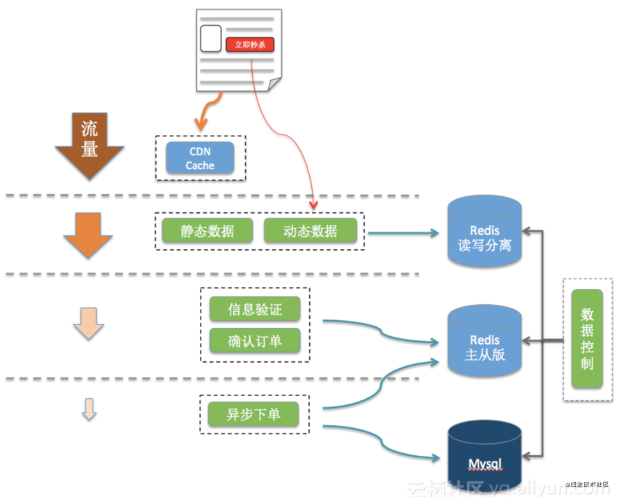 秒杀系统的流量虽然很高,但是实际有效流量是十分有限的。利用系统的层次结构,在每个阶段提前校验,拦截无效流量,可以减少大量无效的流量涌入数据库 。