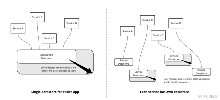 当整个应用程序的数据都在一个集中的数据存储中时,随着应用程序的增长,你必须扩展整个数据存储以满足应用程序中所有服务的需求。这显示在图1的左边。如果你为每个服务使用单独的数据存储,只有需求增加的服务需要扩展,而被扩展的数据库是一个较小的数据库。这在图1的右边显示。