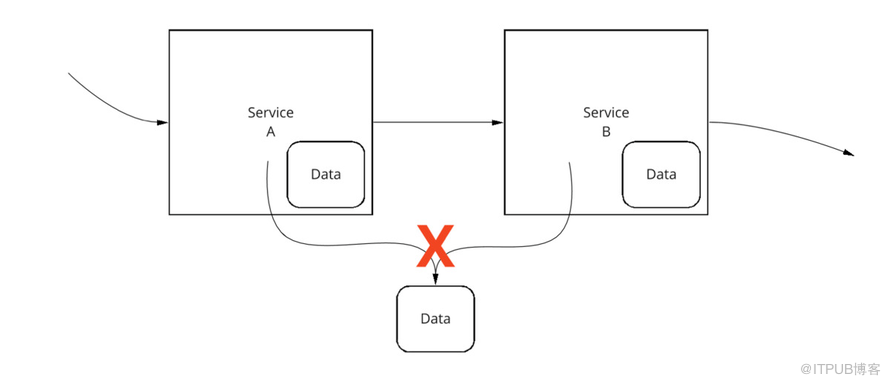 问题是,一个团队要拥有一个服务的所有权,他们必须同时拥有该服务的代码和数据。这意味着一个服务(服务A)不应该直接访问另一个服务(服务B)的数据。如果服务A需要存储在服务B中的东西,它必须调用服务B的一个服务入口点,而不是直接访问该数据。