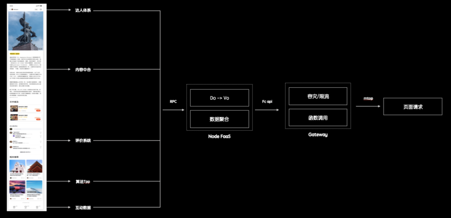 一个最新的例子(如下图所示),这是一个飞猪的内容详情页,页面涉及内容中台、评价中台、互动、算法等 5 个以上接口,这些接口都是现成的分散在各个系统,对于前端来说肯定是不想在端上调 5 次接口,不管是从性能还是架构设计上考虑,都是不合理的,这时就需要一个服务端接口的合并,FaaS 就非常适合做这样的事情,通过原子能力的拼装,无需服务端介入,极大缩短了需求的交付周期。