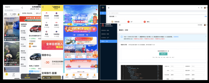 从飞猪首页到搜索、频道,再到大促会场,Serverless FaaS 实现了在飞猪导购全链路的覆盖,成为飞猪前端的常用生产力工具之一。另外中后台开发已全面使用 FaaS 开发,并且赋能客户端同学,下图右侧的包体积平台就是飞猪客户端同学使用 Node FaaS 开发完成。