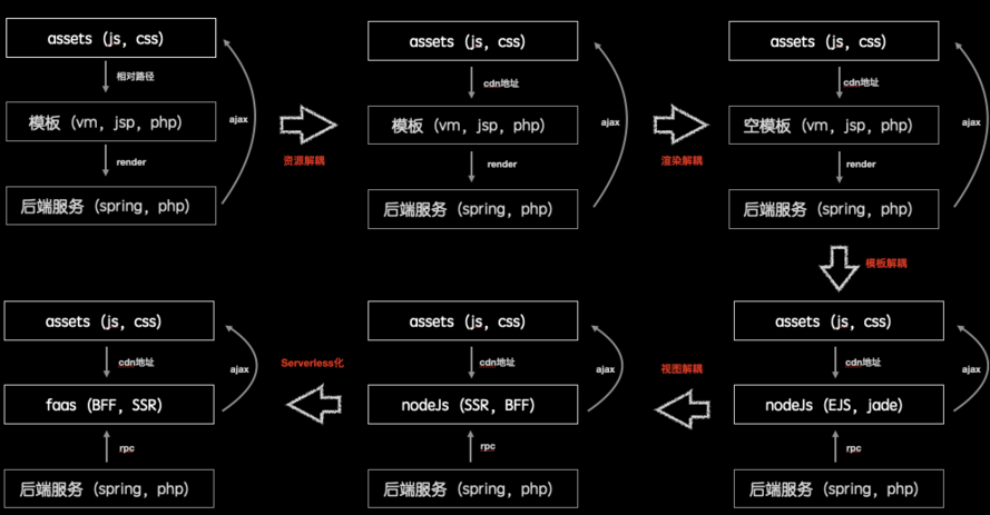 ,我们之前提到的前后端解耦大部分指的就是模板的解耦,一种不彻底的解法就是渲染解耦,服务端放一个空模板内容部分全靠 CSR,彻底的解法就是前端接管模板,可以独立部署模板也可以使用 node.js 替代。