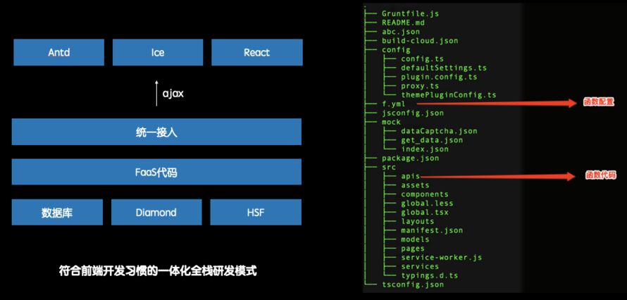 一体化研发是一种更加符合前端人员习惯的开发模式,常见的分为中后台一体化和 Rax+FaaS 一体化,将 FaaS 代码和 Assets 代码在一个仓库下开发,调试和部署能够极大地提高开发效率,目前飞猪用得最多的就是中后台一体化开发。
