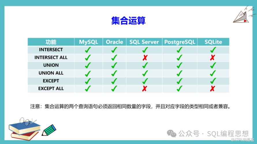 本文比较了五种主流数据库实现的集合运算,包括 MySQL、Oracle、SQL Server、PostgreSQL 以及 SQLite。
