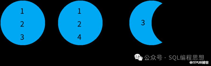 图 中第一个查询的结果只有元素 3 没有出现在第二个查询的结果中,因此差集运算的结果只返回了 3。SQL 差集运算的语法如下: