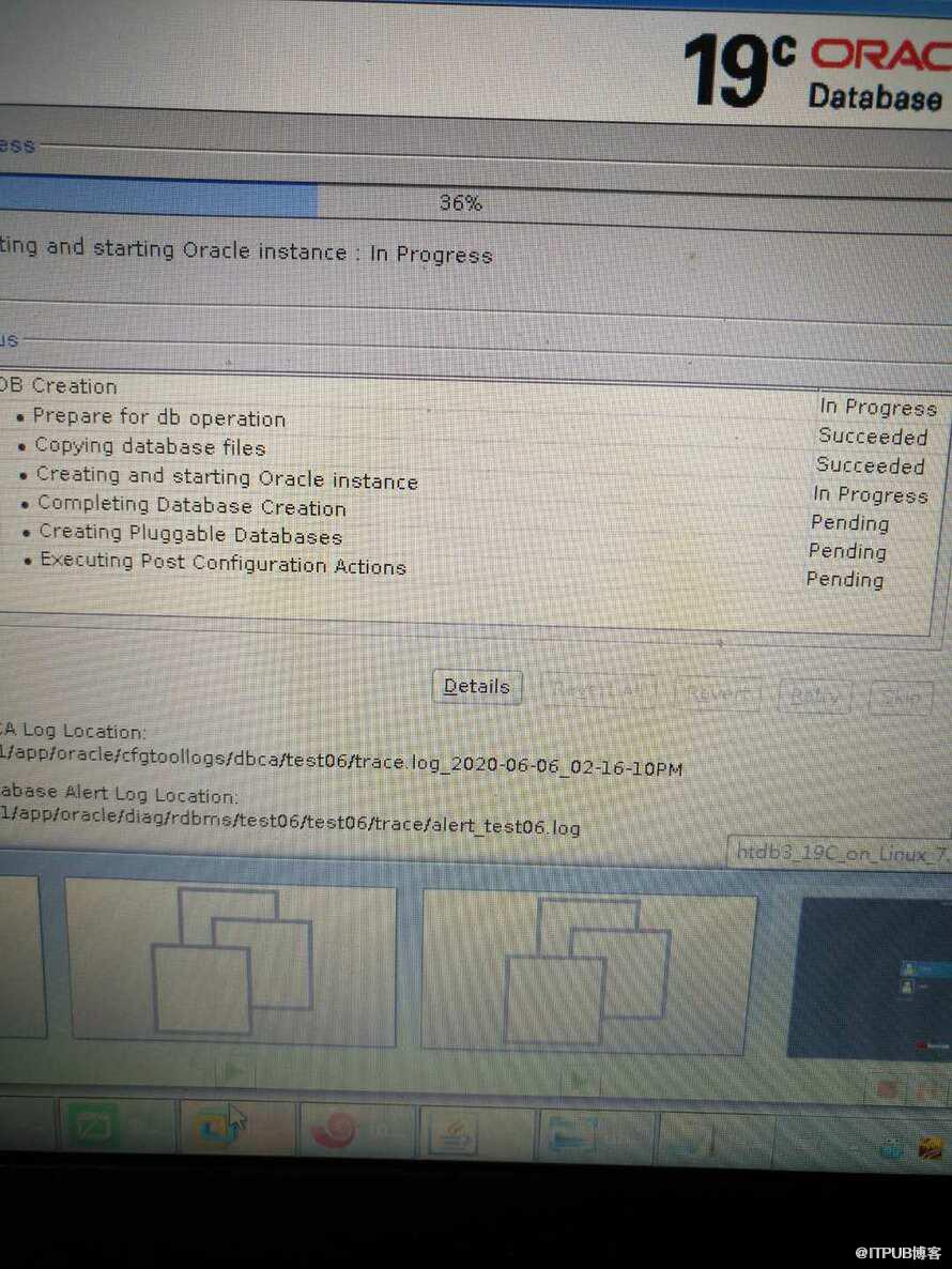 百度,mos都没有找到对应的解决方法,上班前去得早,查了一个多小时无果(真要纠缠下去,难度要开SR不成),后来想想,估计当时的环境是已经运行了一个CDB实例,然后再去dbca创建,是不是和这个有关,决定下次,不启动已有的htdb实例,然后dbca试试,果然到了今天顺利了,执行过程部分截图如下