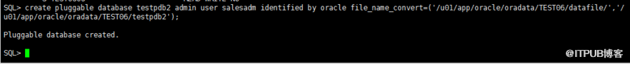 create pluggable database testpdb2 admin user salesadm identified by oracle file_name_convert=('/u01/app/oracle/oradata/TEST06/datafile/','/u01/app/oracle/oradata/TEST06/testpdb2');