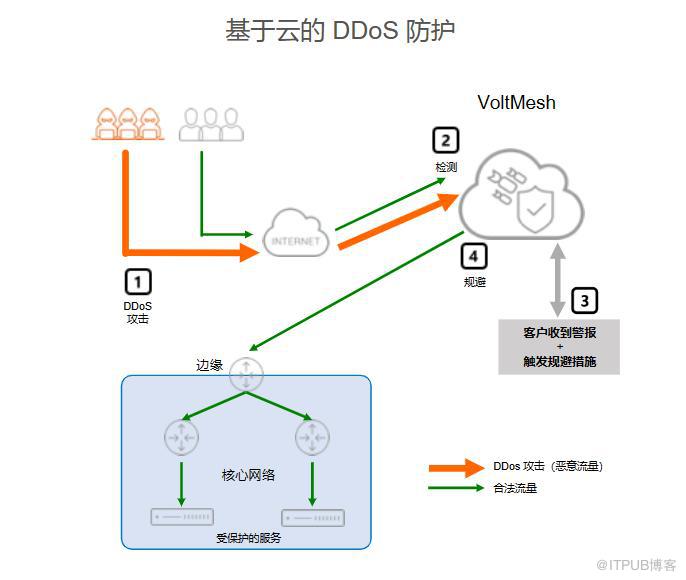 当本地设备无法处理全部攻击时,在运营多个IP传输服务和大规模DDoS攻击防护的情况下,F5分布式云平台的巨大作用得以发挥。如果容量攻击超过本地设备或互联网链接的容量,则客户团队可通过API调用或直接在分布式云门户中激活规避功能,然后分布式云将快速公告受到攻击的IP前缀并在60秒内实施规避。清洗后的流量将通过直接BGP对等互连或GRE隧道从分布式云进行接收。