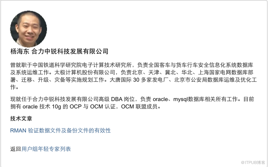2015年5月15日 收到邮件《恭喜获得Oracle用户组年轻专家称号 - 2015年5月》,收到邮件时的心里是无比的开心 。首先还要先感谢ACOUG这个组织,能我这样一个机会,再有就是导师secooler老侯以及所有身边的爱技术的好朋友们。功夫不负有心人,坚持写技术博客,分享技术的同时又提升了自己,何乐而不为。这些年的学习与积累还是见到了成效。与此同时也给自己打了一针强心剂,继续学习,不断学习,给自己定更高的目标,向业内大牛们学习,争取早日与他们会师。哈哈哈,太开心了,不想了,脚踏实地,做好自己该做的。今年首要目标完成OCM11G UPGRADE。加油!加油!