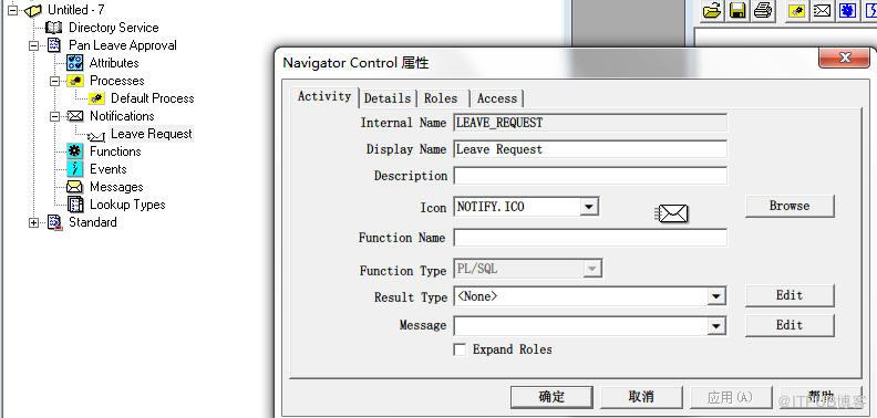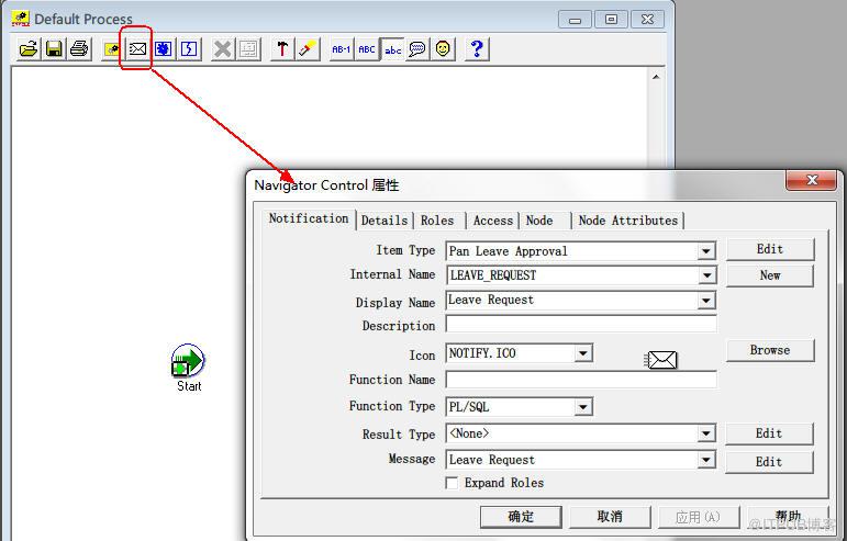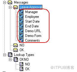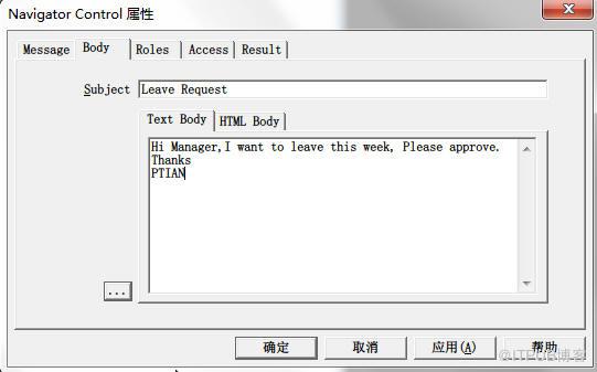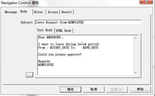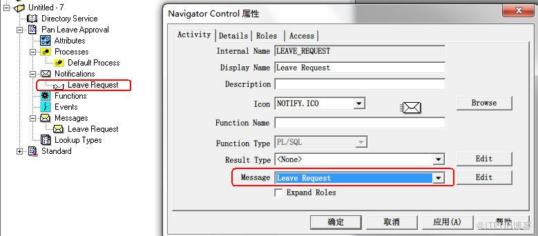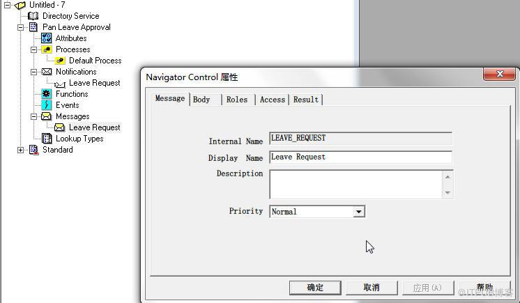 然后再重新打开‘Leave Request’ Notfication的属性面板,在Message项上关联刚才新定义的Message