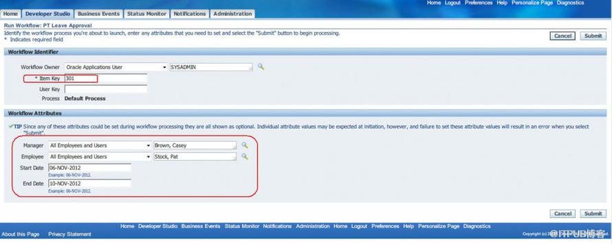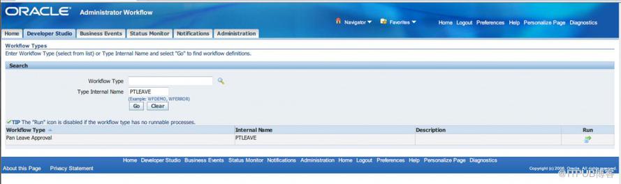 接着登陆到系统,职责:Workflow Administrator Web Applications,功能:Developer Studio,\'Type Internal Name\'为工作流的Item Type的Internal Name,找到后点击‘Run’按钮(如果你看不到这个按钮,需要切换到sysadmin用户)