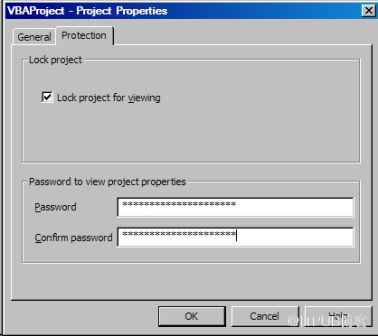 Development Tools页签 > Visual Basic Editor (Alt+F11),然后VB Editor界面下,Tools>VBAProject Properties