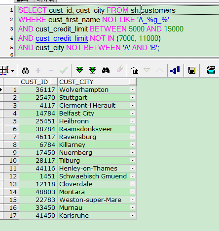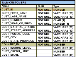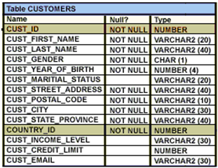 SELECT cust_id, cust_last_name "Last Name" FROM customers WHERE country_id = 10 UNION SELECT cust_id CUST_NO, cust_last_name FROM customers WHERE country_id = 30; |