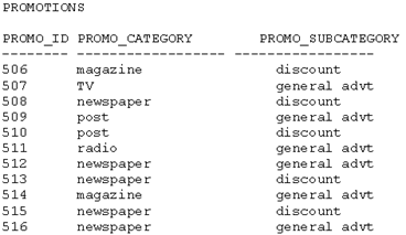 A. SELECT promo_category FROM promotions MINUS SELECT promo_category FROM promotions WHERE promo_subcategory = 'discount'; B. SELECT promo_category FROM promotions INTERSECT SELECT promo_category FROM promotions WHERE promo_subcategory = 'discount'; C. SELECT promo_category FROM promotions MINUS SELECT promo_category FROM promotions WHERE promo_subcategory <> 'discount'; D. SELECT promo_category FROM promotions INTERSECT SELECT promo_category FROM promotions WHERE promo_subcategory <> 'discount'; |