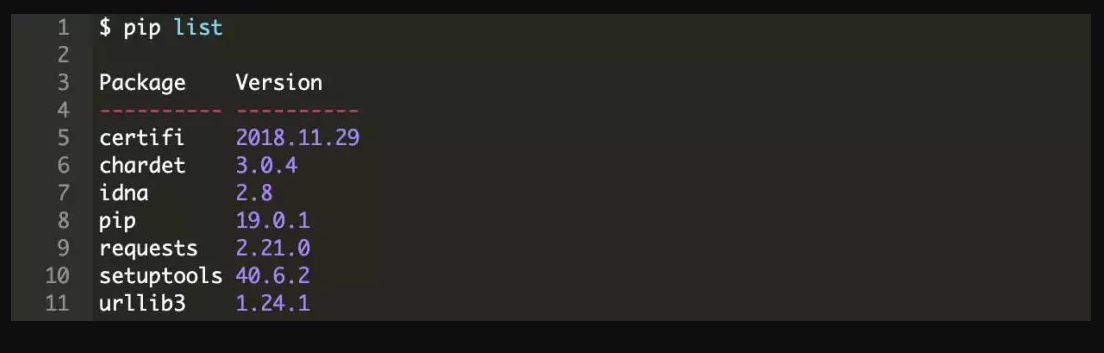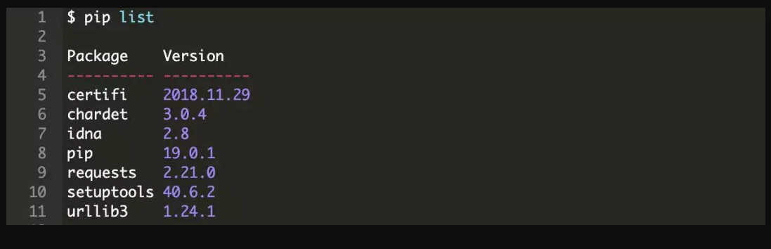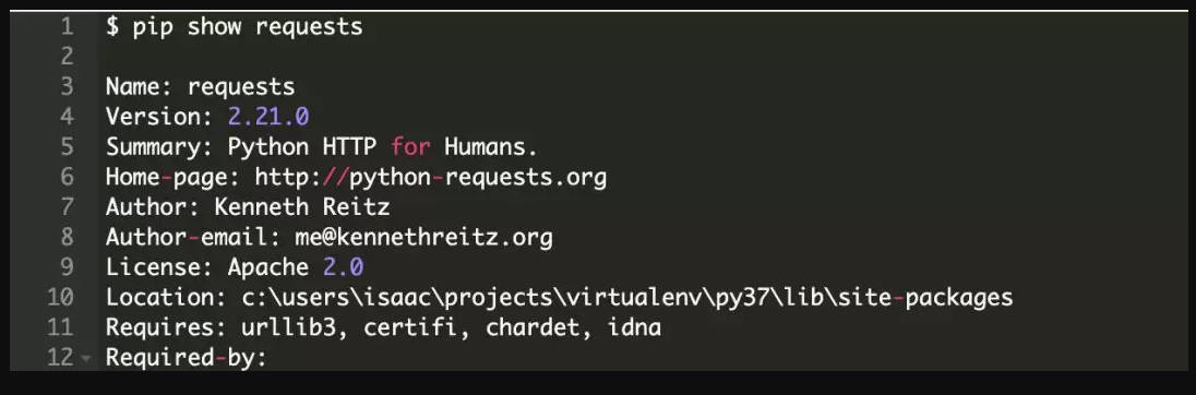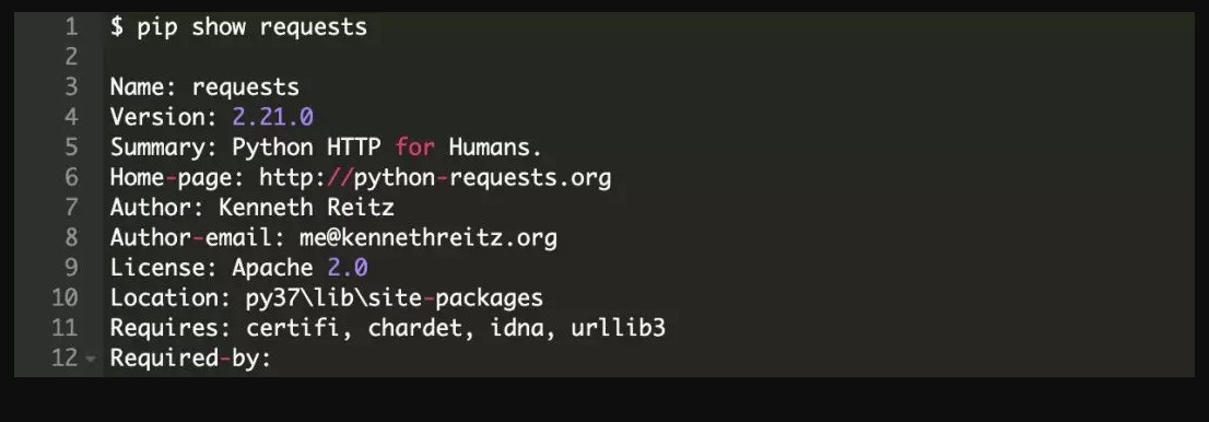 注意这里,当你安装了 requests,pip 同时也安装了其他的依赖。你安装的包越多,多个包拥有相同的依赖的可能性越大。这里 pip 的 show 命令就派上用场了。