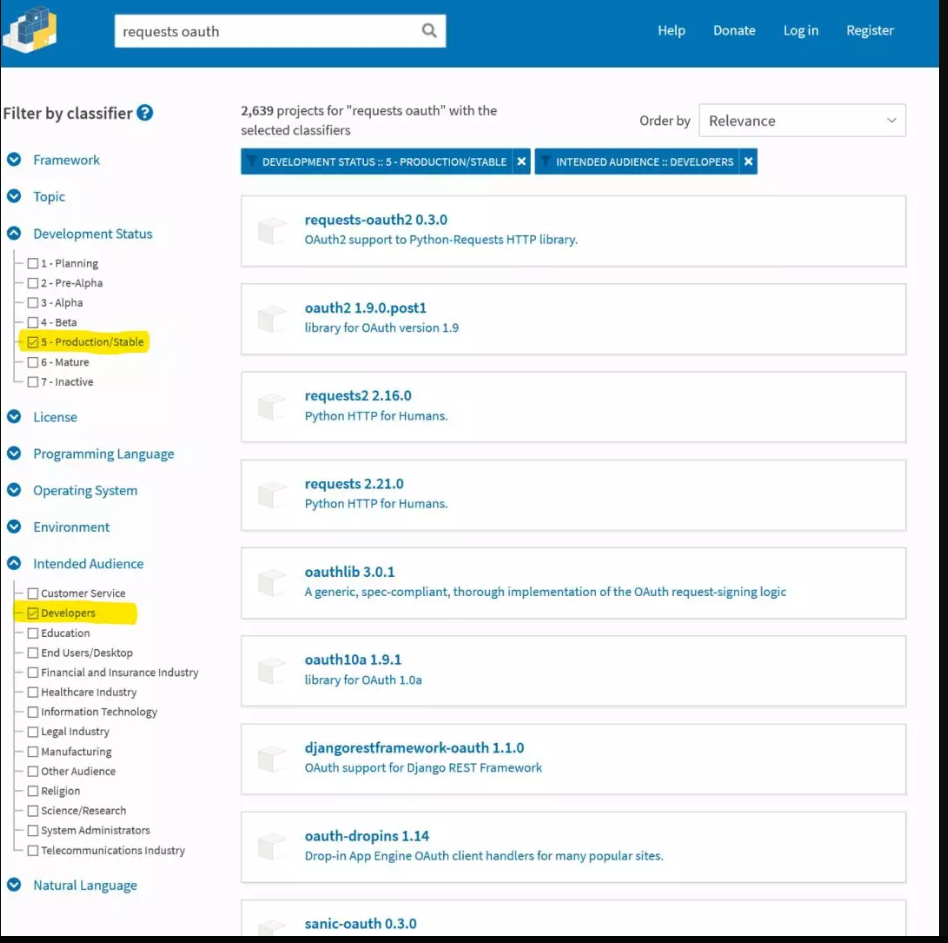 PyPI 中用同一个术语搜索可能会产生大量的结果,不过你可以对它们进行分类过滤。比如,如果你想要找到可以帮助你开发应用的库,你可以展开 Intended Audience 并选择 Developers。另外,你可能还需要一个稳定且可用于生产的包,可以展开 Development Status 并选择 Production/Stable。