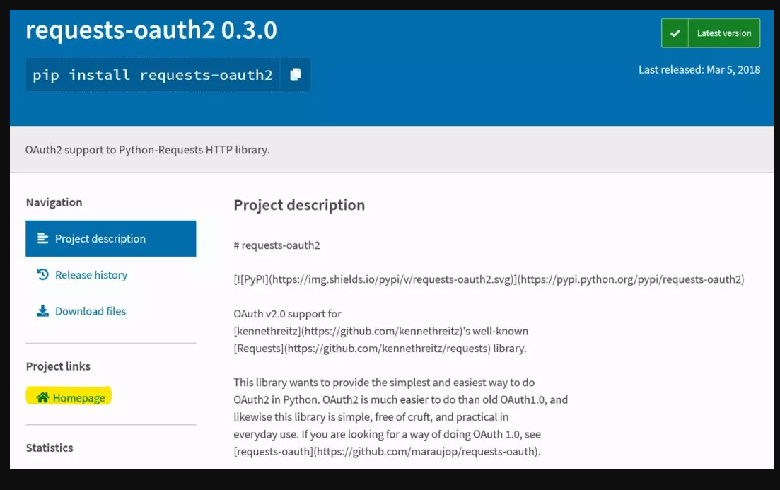 搜索结果提供了一个包页面的链接,包含了更多的信息以及想要的文档。下面我们看看 requests-oauth2 的信息: