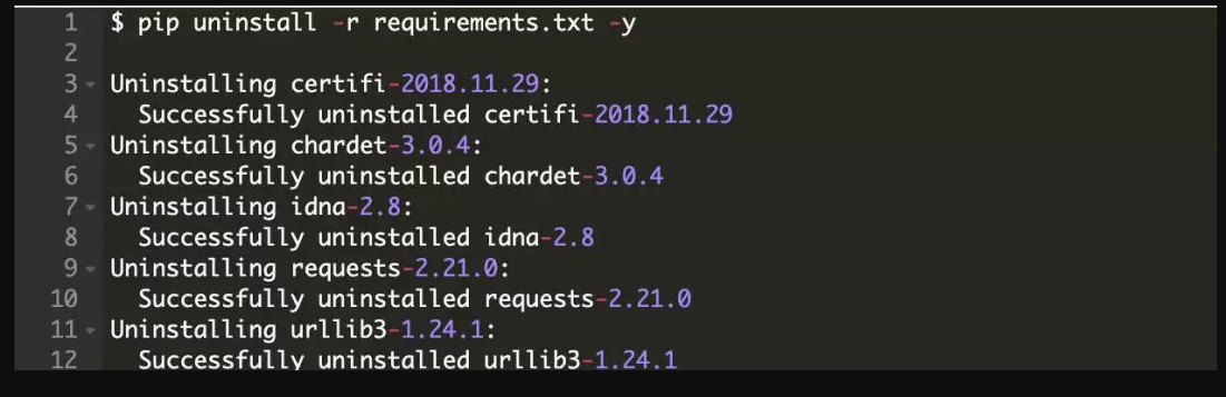 你还可以通过提供 -r 选项来删除需求文件中列出的全部软件包。这个命令会对每一个包都提示确认信息,如果你已经明确知晓你的操作,可以通过 -y 开关禁止这些提示: