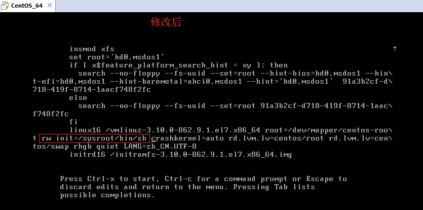 3、修改好后按 Ctrl+x.,使用单用户模式启动,进入后,依次输入如下指令: