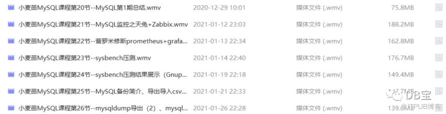 • MySQL基础PPT文档• 小麦苗MySQL课程第1节--Docker入门• 小麦苗MySQL课程第2节--MySQL基础知识和使用rpm包离线安装MySQL• 小麦苗MySQL课程第3节--MySQL在线yum安装和二进制安装、配置多版本多实例• 小麦苗MySQL课程第4节--MySQL Linux二进制单实例安装、编译安装、Windows上msi和二进制安装• 小麦苗MySQL课程第5节--第三方工具dbdeployer安装MySQL、MySQL修改密码和远程登录• 小麦苗MySQL课程第6节--忘记root用户密码、卸载MySQL、MySQL启动和关闭命令、MySQL升级• 小麦苗MySQL课程第7节--数据类型、登陆、常用维护SQL• 小麦苗MySQL课程第8节--常用维护SQL、SQL提示符、重复数据处理• 小麦苗MySQL课程第9节--查询综合案例(简单查询、关联查询、排名问题、连续性排名问题等)• 小麦苗MySQL课程第10节--索引、视图、跑脚本、运算符、函数(系统函数+自定义函数)• 小麦苗MySQL课程第11节--存储过程、触发器、MySQL大小写问题• 小麦苗MySQL课程第12节--MySQL用户和权限管理、MySQL架构、MySQL参数文件• 小麦苗MySQL课程第13节--套接字、pid、表结构文件、ibdata1、错误日志、全查询日志、事务日志• 小麦苗MySQL课程第14节--Undo历史、ibtmp1、ib_buffer_pool、双写文件、sdi文件等• 小麦苗MySQL课程第15节--慢查询日志、mysqldumpslow工具、二进制日志、mysqlbinlog工具• 小麦苗MySQL课程第16节--二级制日志补充、Redo和Binlog区别、两阶段提交、双写、日志总结、内存结构、磁盘结构、存储结构等• 小麦苗MySQL课程第17节--MySQL进程结构、注释、查询数据库大小和对象、MySQL自带工具、PT工具和mysql-utilities安装、MySQL优化参数简介• 小麦苗MySQL课程第18节--数据库巡检(大小、TOP 10等查询)、PT工具详解1• 小麦苗MySQL课程第19节--PT工具(2)、mysql-utilities工具、图形化工具(Navicat、Workbench、phpmyadmin)• 小麦苗MySQL课程第20节--MySQL第1期总结• 小麦苗MySQL课程第21节--MySQL监控之天兔+Zabbix• 小麦苗MySQL课程第22节--普罗米修斯prometheus+grafana监控• 小麦苗MySQL课程第23节--sysbench压测• 小麦苗MySQL课程第24节--sysbench压测结果展示(Gnuplot)、mysqlslap、HammerDB对MySQL压测• 小麦苗MySQL课程第25节--MySQL备份简介、导出导入csv文本文件、mysqldump导出(1)• 小麦苗MySQL课程第26节--mysqldump导出(2)、mysqlpump、mydumper• 小麦苗MySQL课程第27节--mysqldump+mysqlbinlog恢复误删除的数据库、mysqldump一致性备份问题、PXB软件安装• 小麦苗MySQL课程第28节--PXB下载,全量+增量备份和恢复、压缩备份恢复、全量备份恢复单个表• 小麦苗MySQL课程第29节--PXB全备恢复单表、MySQL误操作恢复神器之my2sql+binlog2sql+MyFlash工具• 小麦苗MySQL课程第30节--主从复制简介、原理、拓扑结构、单主单从搭建及其维护、主从复制常见问题、模拟主键缘故导致的主从不一致等• 小麦苗MySQL课程第31节--主从复制延迟原因、半同步复制、延迟复制、并行复制、GTID复制、1主2从搭建、gtid跳过同步错误• 小麦苗MySQL课程第32节--多源复制、1主2从+HAProxy--读负载均衡、双主+Keepalived--单点故障(故障自动切换)• 小麦苗MySQL课程第33节--1主2从+MySQL Router实现读写分离+负载均衡、1主2从+ProxySQL实现读写分离、负载均衡• 小麦苗MySQL课程第34节--MySQL高可用之MHA架构搭建及其测试• 小麦苗MySQL课程第35节--MySQL高可用之MHA架构测试+(MHA+ProxySQL读写分离)测试• 小麦苗MySQL课程第36节--MySQL高可用之PXC+HAProxy架构• 小麦苗MySQL课程第37节--MySQL高可用之MGR(搭建MGR、单主和多主切换、新增MGR节点、重启MGR、MGR+HAProxy、MGR+ProxySQL)• 小麦苗MySQL课程第38节--数据库中间件简介、分库分表、mycat简介、1主2从+mycat、双主双从+mycat、mycat监控工具mycat-eye• 小麦苗MySQL课程第39节--MySQL高可用切换工具orchestrator+PMM监控(MySQL、MongoDB、PG、ProxySQL)• 小麦苗MySQL课程第40节--MySQL8.0.17的clone技术搭建主从复制环境+添加MGR节点• 小麦苗MySQL课程第41节--监控、压测、备份恢复、主从复制、高可用等总结