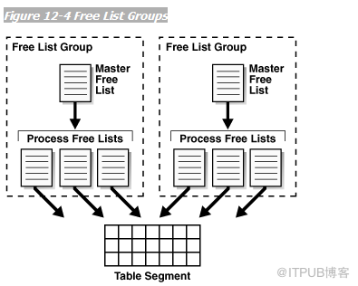 As shown in Figure 12-4, you can also create an object with one or more free list groups, which are collections of free lists. Each group has a master free list that manages the individual process free lists in the group. Space overhead for free lists, especially for free list groups, can be significant.