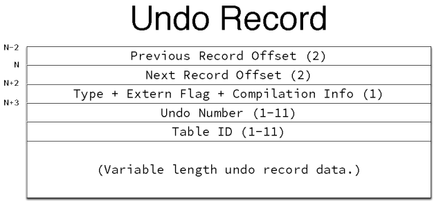 Undo Log的数据存储在系统表空间的UNDO_LOG页中,下面分别是UNDO_LOG页结构、UNDO_LOG页中UNDO页头部和UNDO段头部、UNDO_LOG记录格式示意图
