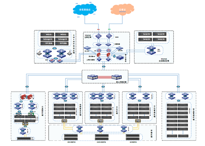 同时,在本项目中,将新大楼数据中心分为五个大区域,分别为海外区域中心、出口接入区、核心交换区、云资源服务区、安全运维管理区域(信息安全、IT运维管理)。