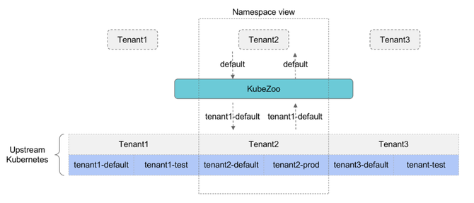 KubeZoo 基于“协议转换”核心理念实现控制面多租户功能,通过在资源的 name/namespace 等字段上增加租户的唯一标志,从而解决不同租户的同名资源在同一个上游物理的 K8s 冲突问题。