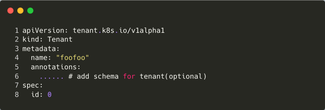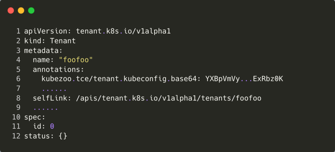 KubeZoo 内置 Tenant 对象,用于描述租户的基本信息,相关的结构体如下。其中 name 是必须字段,全局唯一,长度固定 6 位字符串(包括字符或者数字),理论上可以管理 2176782336 个租户(36 ^ 6),Tenant 对象存储于 KubeZoo 的 etcd 中: