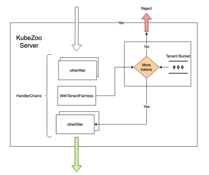 管理员创建租户时通过在 Tenant annotation 中的 tce.kubezoo/max-requests-inflight 字段设置来自该租户请求的最大并发数。KubeZoo 会统计当前租户的并发数(令牌数),每当收到来自某个租户的请求时,KubeZoo 会查看该租户下的 bucket 是否有令牌,如果有,则拿取一个并处理相关的需求,请求结束后归还令牌;如果并发数超过上限,即令牌为空,则拒绝该请求。