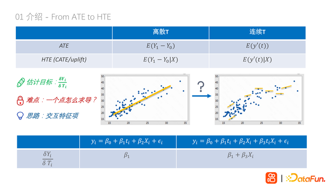 估计HTE的方法有很多,例如casual tree,casual forest等,我们先从线性模型的角度讲解如何从ATE估计到HTE。在实验变量离散的情况下(即传统做法,将用户分为实验组和对照组),ATE的计算公式为两个用户组结果变量diff的期望;在实验变量是连续的情况下(比如实验变量是药剂剂量时),ATE的计算公式就是结果变量对实验变量求导。用散点图说明:当x轴是实验变量、y轴是结果变量时,ATE为各点拟合曲线的斜率。以此类推,HTE需要我们对每个点求斜率。