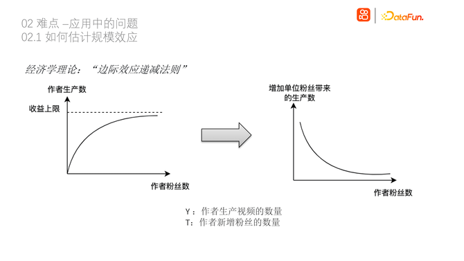 首先是估计规模效应。以作者和作者生产数为例,经济学中有一个理论叫边际效应递减法则:即作者粉丝数增加时,单纯通过涨粉对于作者生产数产生的激励存在一个上限。如上图所示,我们期望看到增加单位粉丝带来的生产数实际是逐渐递减的。如果能预估该作者的涨粉能力上限和生产数上限,对平台资源的分配是有极大帮助。