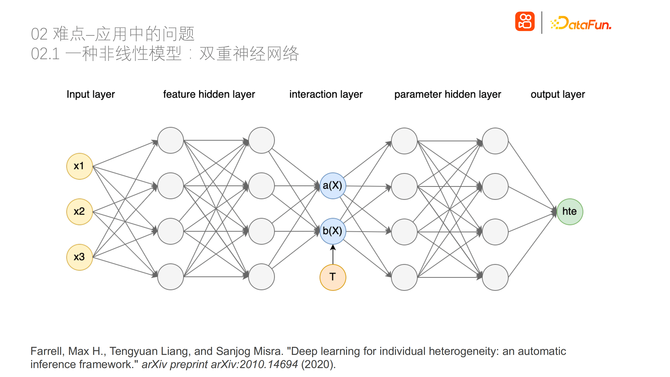 为了解决上述问题,我们基于Farrell在2020年的论文,构造了神经网络的优化模型,并称其为“双重神经网络”模型。input layer由特征变量构成 (如用户画像),经过第 一个神经网络的feature hidden layer构建交互特征;interaction layer包括关于特征变量的函数a(X)以及函数和treatment的交互项b(X),经过parameter hidden layer进行交互得到非线性关系,最后output layer输出得到HTE。