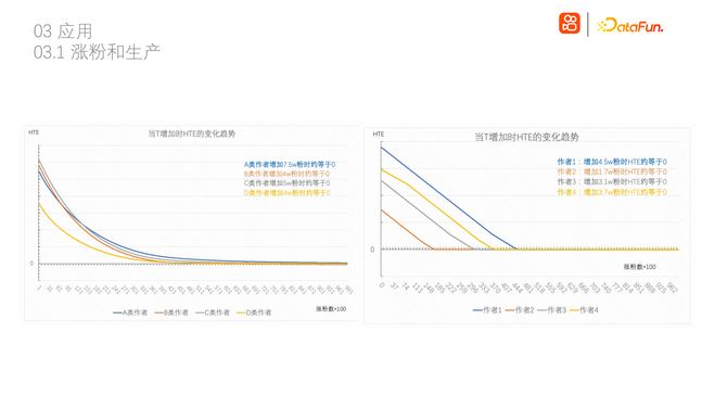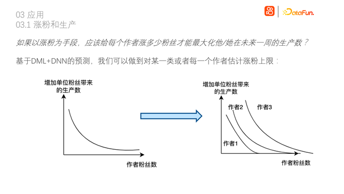 平台希望圈一些作者,并了解他们生产数的最大空间--知道作者的生产数空间可以便于业务request相应活动流量和预算。我们通过优化的模型可以实现对每一个作者估算一个边际效益曲线。模型也可以做到按照作者类型去分类,得到各类作者生成力的边际。除了估计预算,通过预测每个作者的生产力天花板,运营同学可以针对大V作者做相应的策略调整。模型结果如上右图所示:基于过去一段时间的勤劳程度和其他特征,作者1涨粉到4.5万就不再可能通过涨粉增加收益、而作者2涨粉到1.7万就到头了。