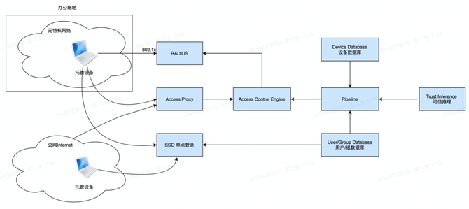 访问控制引擎基于用户、设备、环境数据为每个服务请求提供授权,甚至是基于地理位置的访问控制。比如对于gitlib的访问只会授权给技术部门,对于财务系统的访问只会授权给财务部门的同事。