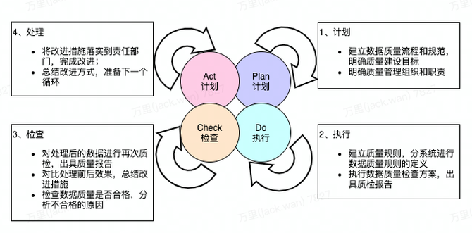 数据质量作为对数据对象的品质进行管控和规范,做到事前规范和流程建立,事中品质管控,事后问题复盘和改进,形成一个对数据质量全流程PDCA的流程闭环。
