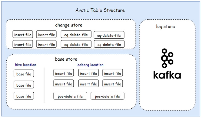 Arctic Table 由不同的 Table Store 组成,TableStore 是 Arctic 在存储系统中定义的表格式实体,Tablestore 类似于数据库中的 cluster index,代表独立的存储结构,目前分为三种 TableStore。