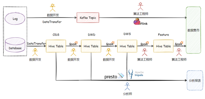 网易云音乐的推荐业务围绕着 Spark+Hive 已经构建了一套成熟的大数据+AI 开发体系,随着业务的增长,业务对整套系统的实时性要求在不断增强,但是直接通过 Flink + Kafka 构建的实时链路并不够完善。在离线链路中围绕着 Hive 有着完善的基础设施和方法论,数据开发和算法工程师通过模型设计中心完成表的设计,数据开发负责数据的摄取,清洗,打宽,聚合等基础处理,算法工程师负责在 DWS 层的数据上实现特征生产算法,分析师通过对 ODS 层、DWD 层以及 DWS 层的表执行Ad Hoc 式的查询并构建分析报表以评估特征数据质量。整套链路层次分明、分工清晰,即最大限度的复用了计算结果,又比较好的统一了指标口径,是典型的 T+1 的数仓建设。但是在实时链路中,数据开发仅仅协助完成原始数据到 Kafka 的摄取,算法工程师需要从 ODS 层数据进行加工,整个链路缺乏数据分层,既不能复用离线计算结果,也无法保证指标的一致性。