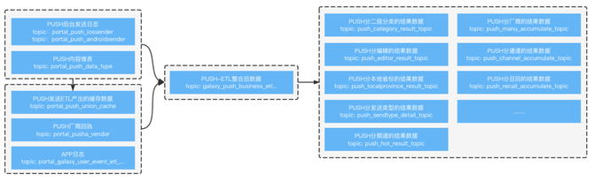 由于推送时机的不确定性,push 业务的数据指标一般不是增量型的,而是以当天截止到当前的各种累计型指标为主,计算窗口通常为十五分钟到半小时不等,统计维度区分发送类型、内容分类、发送票数、发送厂商、首启方式、用户活跃度、AB 实验等,具有流量波动大和数据口径繁多等特点。
