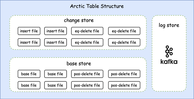 Arctic 能够兼容已有的存储介质(如 HDFS)和表结构(如 Hive、Iceberg),并在之上提供透明的流批一体表服务。存储结构上主要为 Basestore 和 Changestore 两部分: