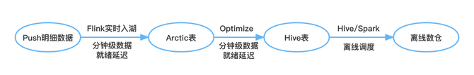 实现 push 业务场景下的数据湖改造,只需要使用 Arctic 提供的 Flink Connector,便可快速地实现 push 明细数据的实时入湖。