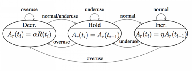 基于延迟的评估算法包括Transport-CC和Goog-REMB,目前最新版的WebRTC默认使用的是Transport-CC。Transport-CC在发送端进行带宽评估,接收端通过TransportFeedback RTCP包向发送端反馈每个RTP包的到达时间,发送端在一个时间窗口内计算每个RTP包到达时间与发送时间之差,通过Trendline滤波器处理后预测网络状况。假设我们当前处于Hold状态,如果检测到网络状态为OverUse,此时应该减小数据量,变更为Decrease状态;如果检测到网络状态为Normal,此时可以尝试增加数据量,变更为Increase状态。