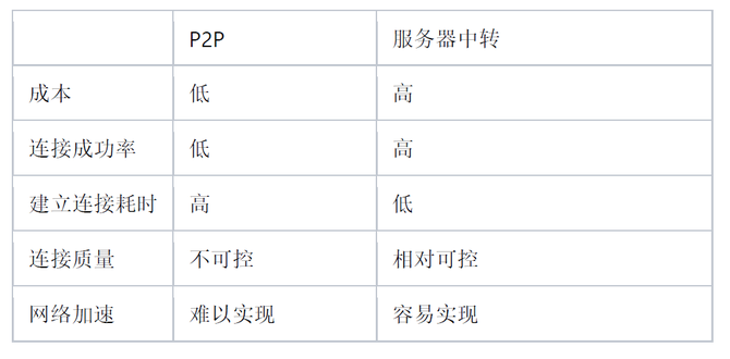 首先对P2P和服务器中转两种方案做个对比: