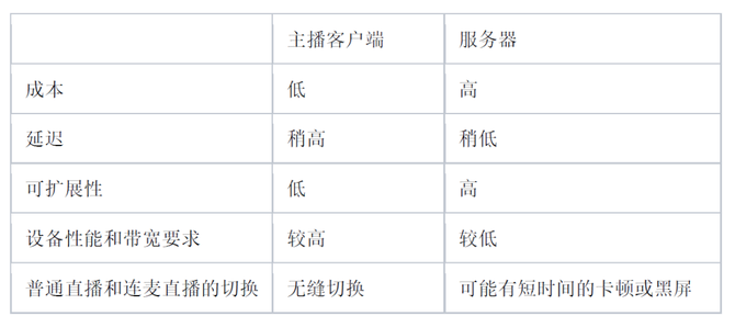 服务器进行混流需要先解码再编码,这需要消耗大量计算资源,所以成本很高;主播客户端进行混流需要额外增加一路流的编码和上传,对设备性能和上行带宽来说也是很大的挑战。主播客户端需要等待服务器把对方的流发送过来才能混流,所以从延迟的角度来看服务器混流稍微占据优势,不过这个延迟相比CDN的延迟可以忽略不计。如果后期对通话质量要求变高,主播的设备性能和上行带宽跟不上,我们可以很容易增加服务器来扩展计算资源和带宽,所以在可扩展性方面服务器混流胜出。另外,当主播从正常直播切换到连麦PK状态的时候,采用服务器混流必须先把直播的流停掉再由服务器接管,中间的时间差可能会产生卡顿或黑屏影响观众体验,而主播客户端混流可以做到无缝切换。